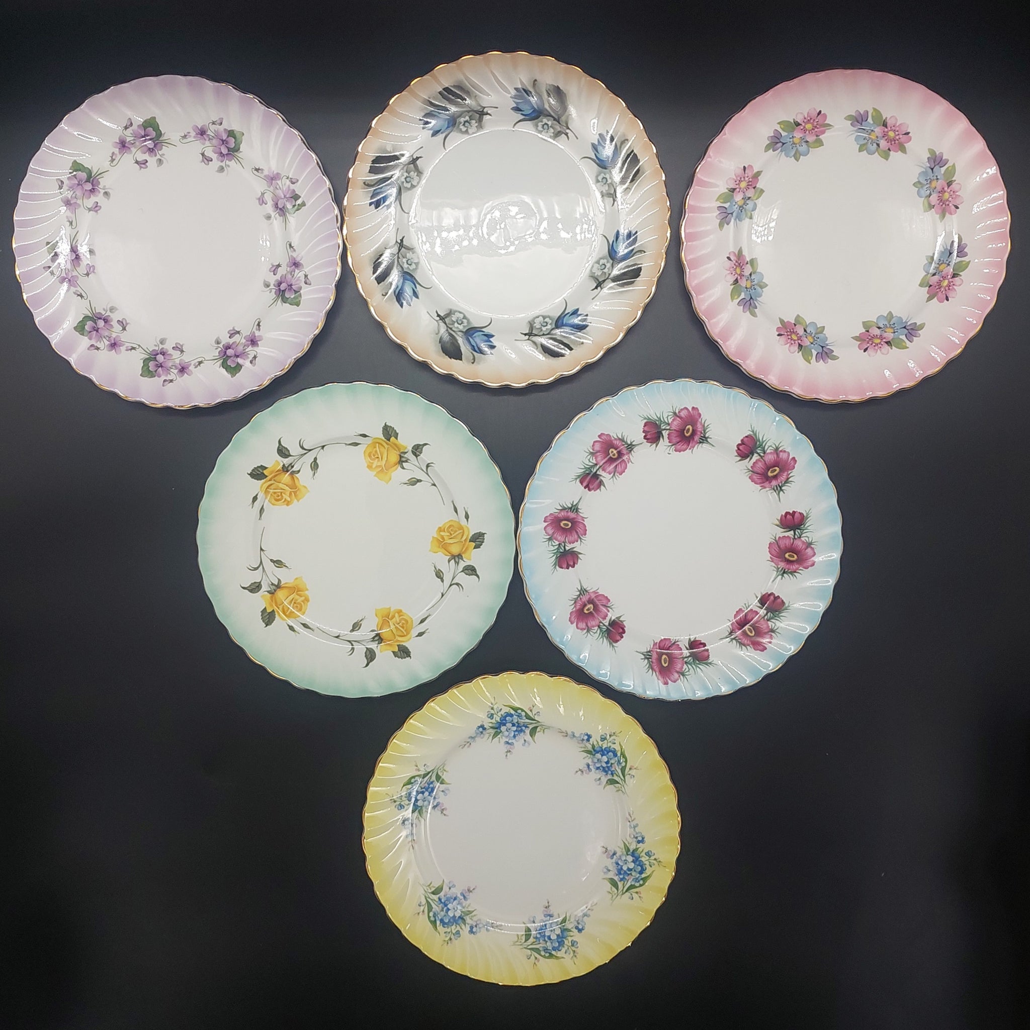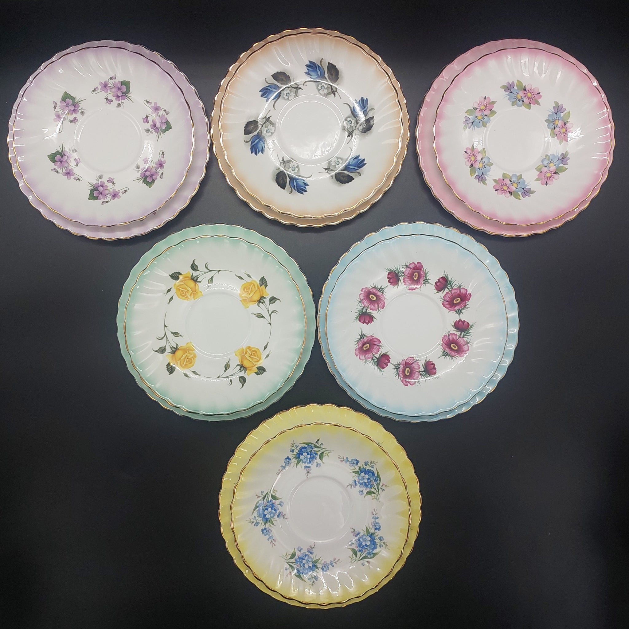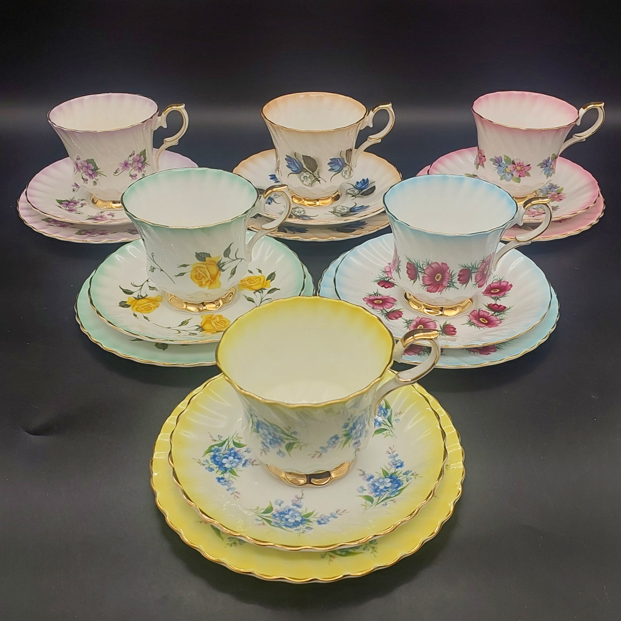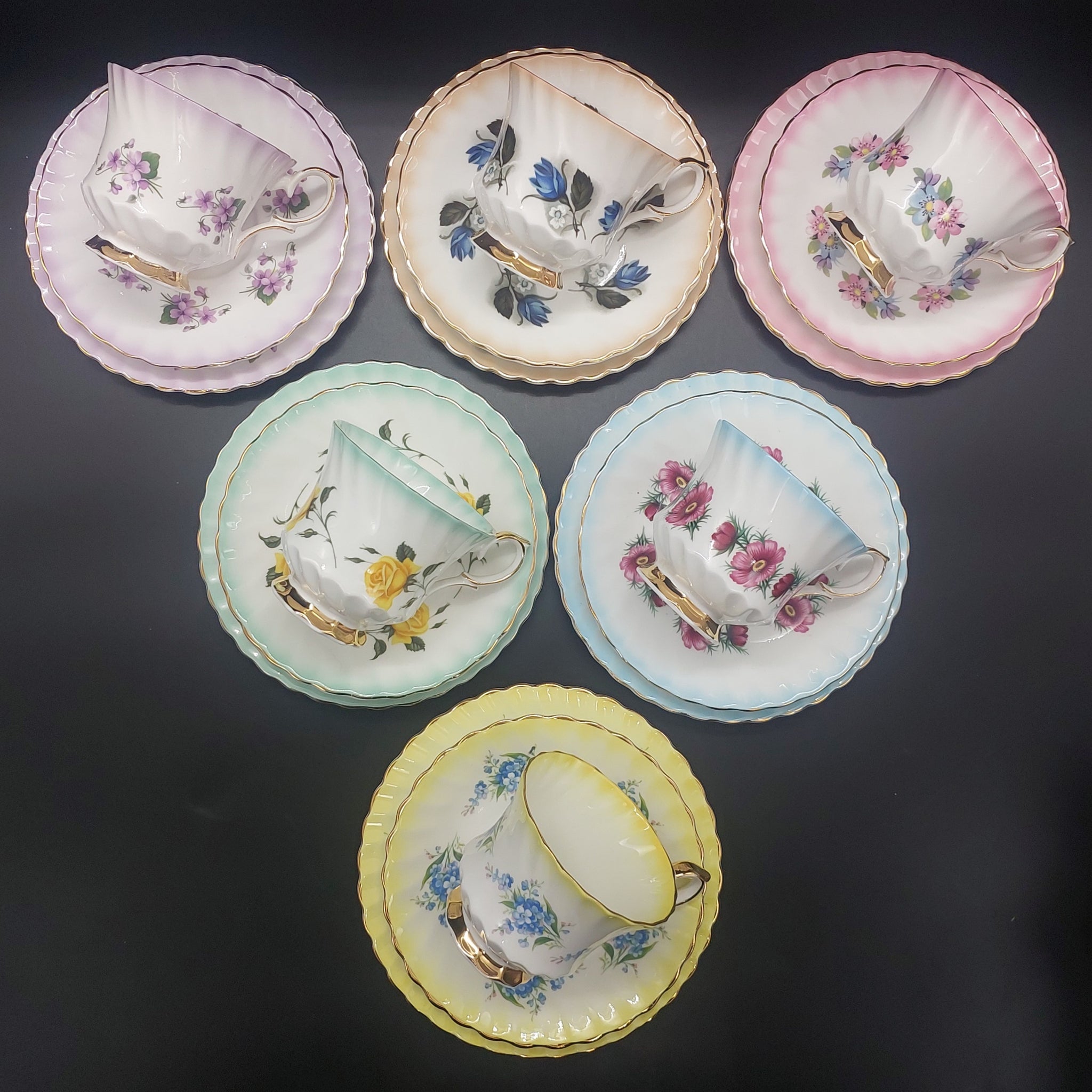 Queen Anne - Spring Flowers with Coloured Rims - Set of 6 Trios